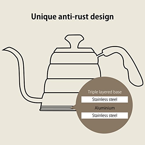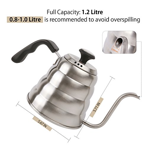 Material: 18/8 Stainless steel Triple layered bottom material: 201 Stainless steel Aluminum 18/8 Stainless steel Capacity: 1.2L(Functional Volume:0.8L-1L) Bottom size: 5.67inch Kettle Nozzle size: 0.8mm Thermometer gauge range: 0-100°C/ 30-220°F Tips