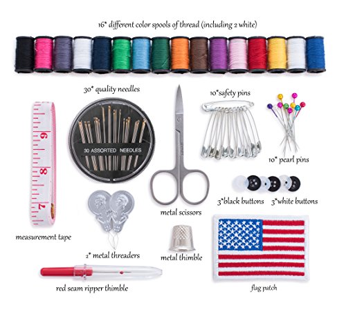 - EXCLUSIVE BONUS GIFT! enjoy a special gift that no other sewing kit has–red, white & blue USA flag patch! Patch up a hole or simply decorate to show your patriotism! If not satisfied, PLEASE contact us to receive a money back guarantee