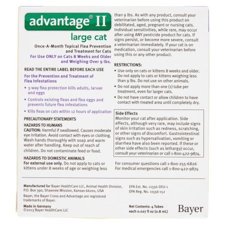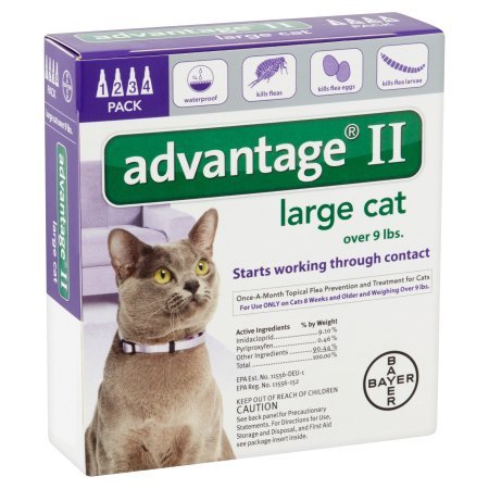 Studio : Advantage Publisher : Advantage Binding : Misc. Product Description Fight the misery of biting fleas with Advantage II! This convenient, easy to apply monthly topical kills fleas through contact, so they don't have to bite your cat to die. Fleas don't just make your cat itchy, they keep biting and hurting again and again. If a flea is ingested it can also cause tapeworms. Advantage II kills adult and immature stages of fleas, thereby effectively breaking the flea life cycle and preventing flea infestations. Since fleas can be brought into your home by you or other pets without even realizing it, it is important to treat indoor pets too. Remember, if your cat has fleas, you have fleas! 0