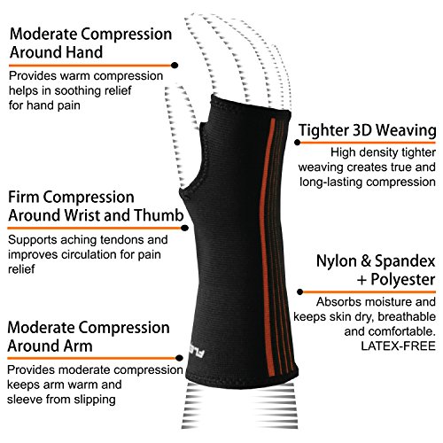 Key Features: ≫ OPTIMAL COMPRESSION enhances thumb and wrist strength and stability while improving blood circulation for quick muscle recovery ≫ SOFT TIGHTER WEAVING creates warm and high density wrist sleeve for true, even and long-lasting compression ≫ ERGONOMIC DESIGN makes the wrist sleeve flexible and perfect fit to either left or right hand ≫ ULTRA LIGHTWEIGHT suitable for all sports and activities providing day and night comfort, flexibility and durability