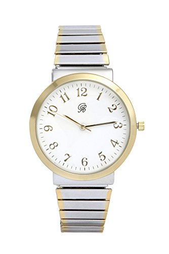 Unisex Two Tone Gold and Silver Stretch Band Classic, Easy Reader Watch with Clear Gold Arabic Numbers on Dial, Medium Size Face - 8197 Two Tone