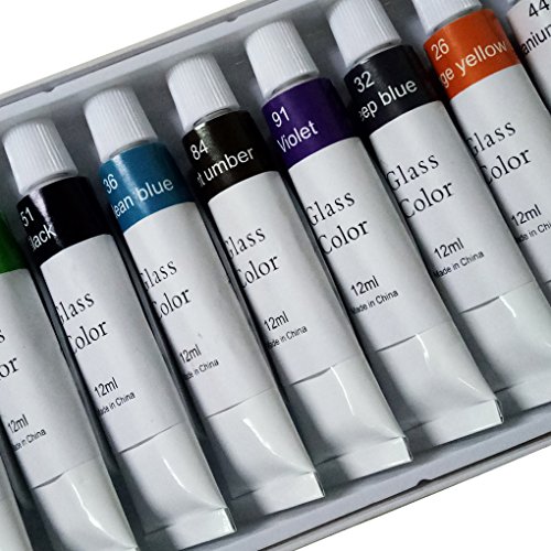 - Assorted Colors: Our Art Ceramics Paint Set includes 12 glass paint tube and one palette (Random Color) AS BONUS.All the glass painting are well sealed up and organized in the box,with a recycled plastic tray and transparent film covering the box which makes sure that the glass paint are well protected from damage in transport. This Glass atr paint set have 12 colors,such as lemon yellow, burnt umber, phthalocyanine blue etc. Every glass painting tube is filled with 12 ml(0.4 oz).
