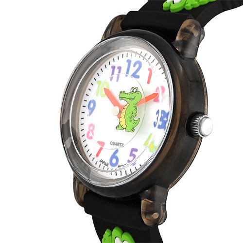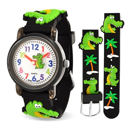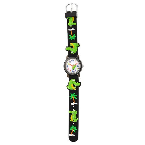See you later alligator. It is always time for fun with our adorable alligator and palm tree kids watch. No need to fear this adorable creature or to fear being late again. Your little one will always arrive on time with this cool kids watch on his or her wrist. Whimsical and fun, our happy alligator croc animal watch is designed on a black rubber strap. Our analog black animal watch makes learning to tell time easy. The cool crocodile watch features a dial with colorful numbers and hour, minute and second hands to help him or her along the way. An alligator acts as the second hand. The rubber strap of the black kids animal watch is packed with a cool and brightly colored design of green and yellow alligators whose eyes pop out and palm trees for that tropical look that will make him or her think of being on vacation. The black rubber strap is made of smooth, soft rubber and will prove very comfortable on his or her wrist. Since the black rubber band can adjust from 5 inches to 7 inches, this fun animal watch can also grow along with your child. The 3D pvc strap is durable. Our black rubber watch boasts palladium nickel plating on the case, a Japanese movement and a stainless steel back for a long lasting life. Order this cute crocodile animal watch today and start him or her on a lifetime of learning.Feature