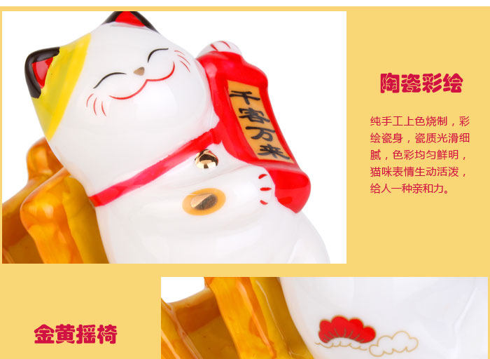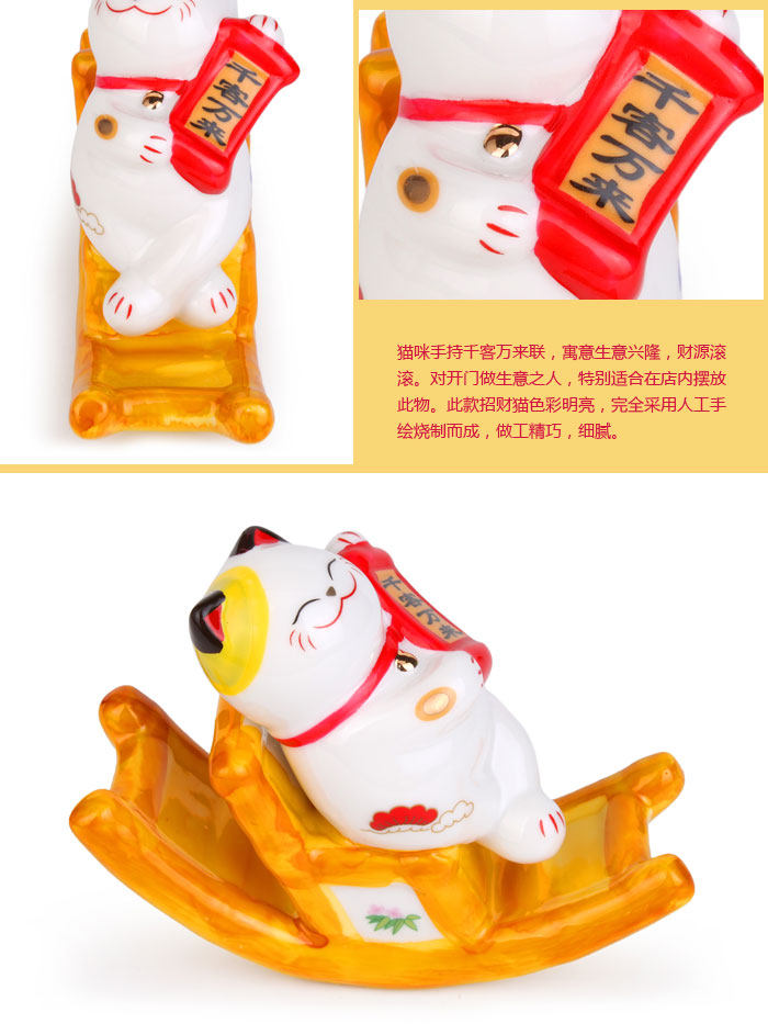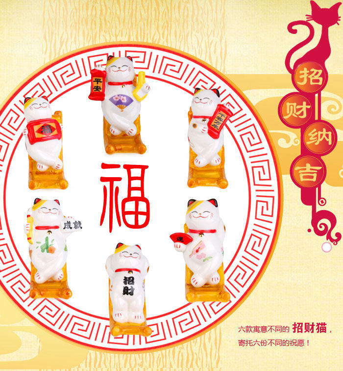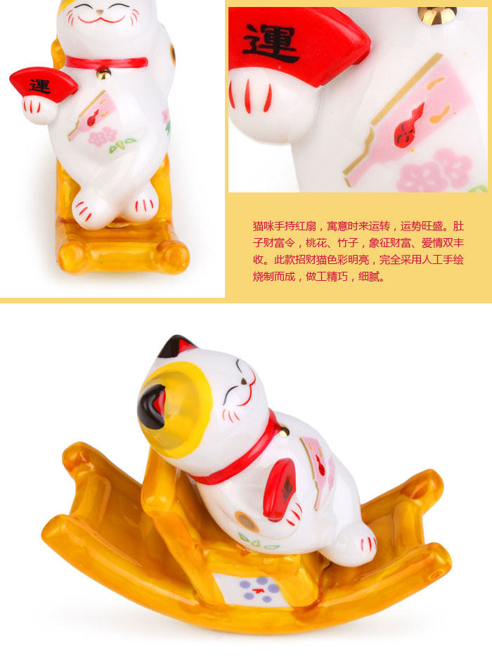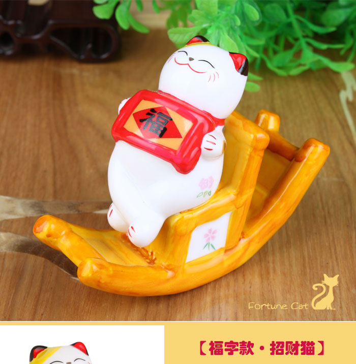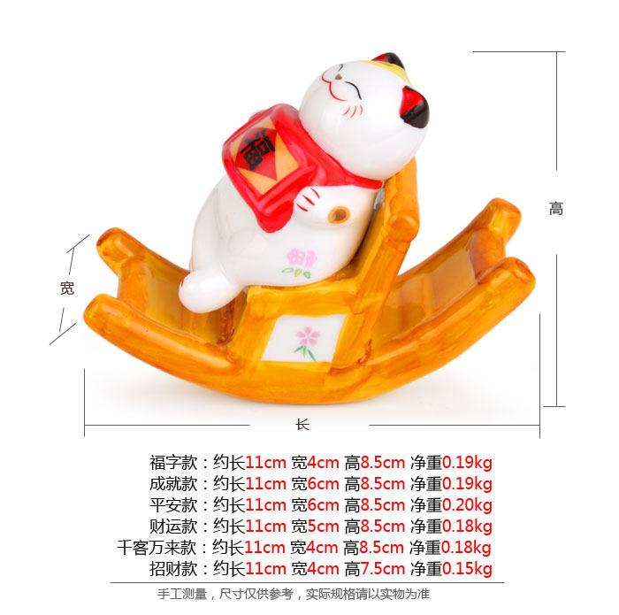 产品特点: 自古以来招财猫被日本视为招财招福的吉祥物,招财猫的神情可爱、讨喜,所以供在家中或铺头放个招财猫,能招来福气与财运。 产品相关介绍: 名称:招财猫 材质:陶瓷 尺寸:福字款:约长11cm*宽4cm*高8.5cm (其它款详情如下) 重量:福字款:约0.19kg(净重) (其它款详情如下) 包装:普通包装