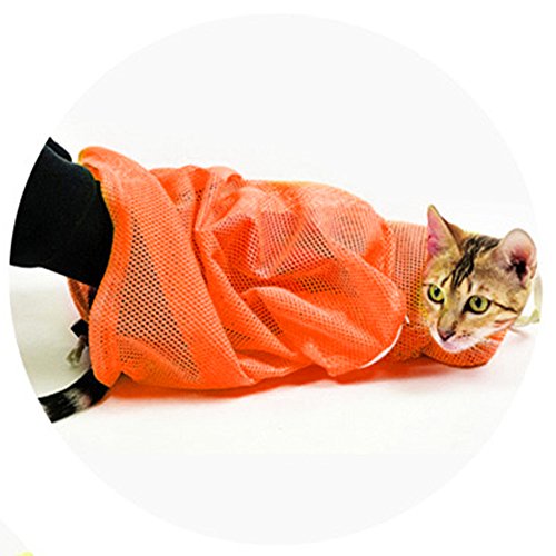 Can be used for cats, made of high quality polyester, mesh design to let water in and out when bathing Size: Dimension: 20" L x 14" W, fit neck girth smaller than 12.6" (Fits for all cats in different body shape and ages) Package includes: 1 * Cat Grooming Bag 0