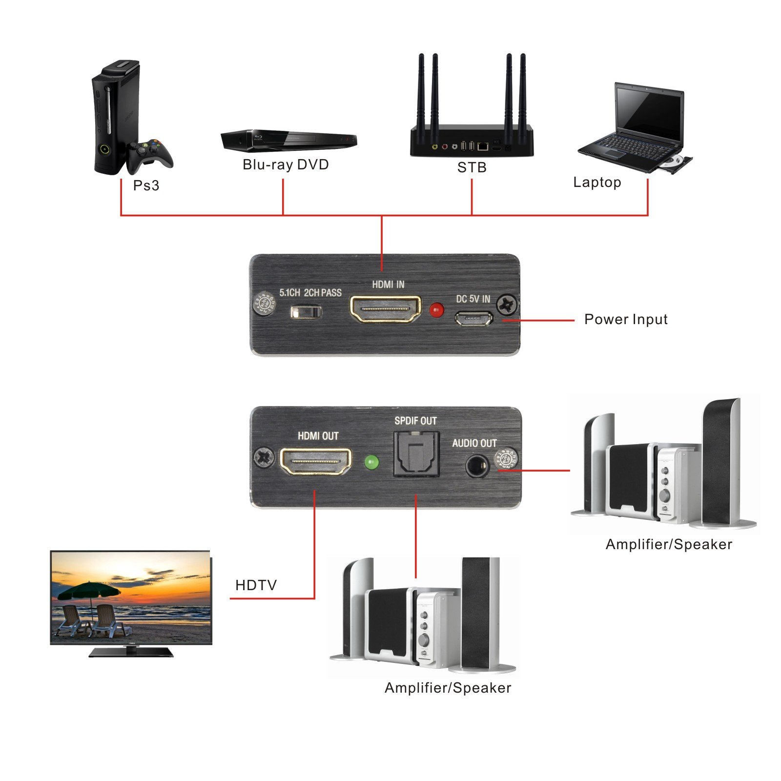 2CH mode: Digital 2CH PCM from HDMI input Derive stereo audio signal and convert it to analog stereo audio output through RCA L / R analog output and support 5.1CH AC3, DTS 5.1CH