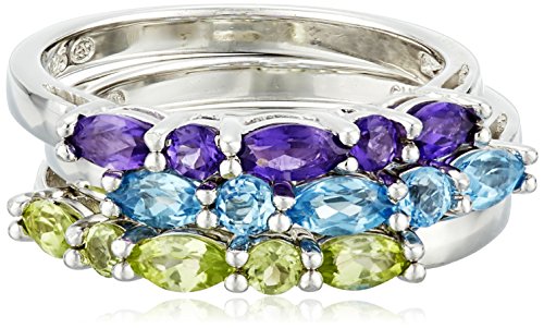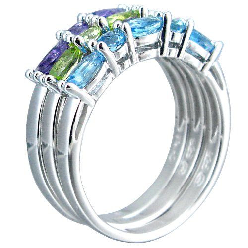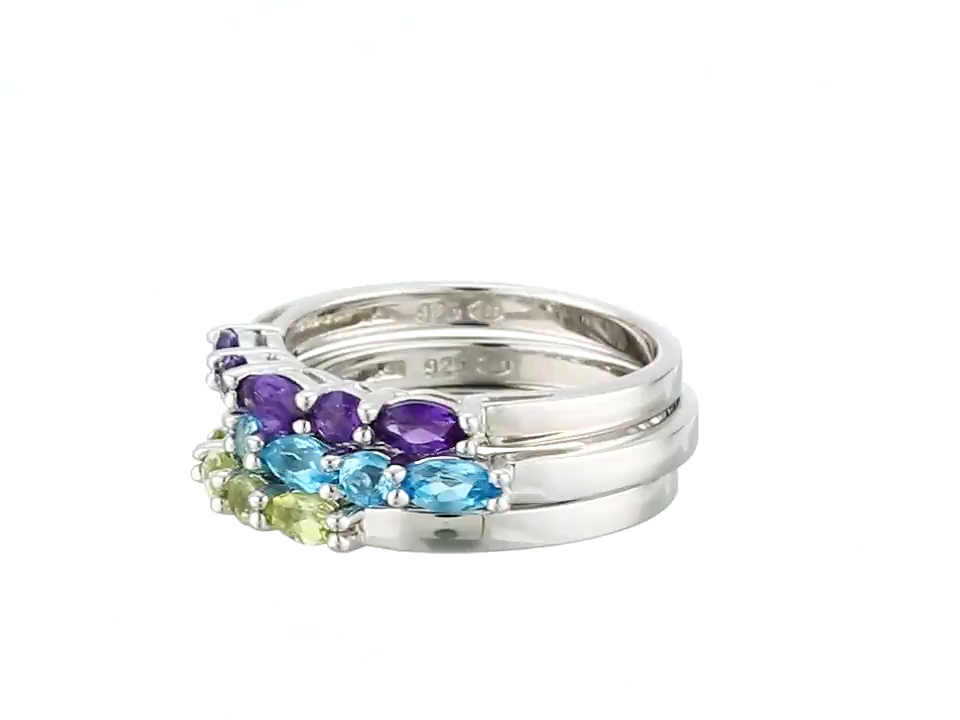 Set of three Sterling silver rings set with peridot, amethyst, and blue topaz stones