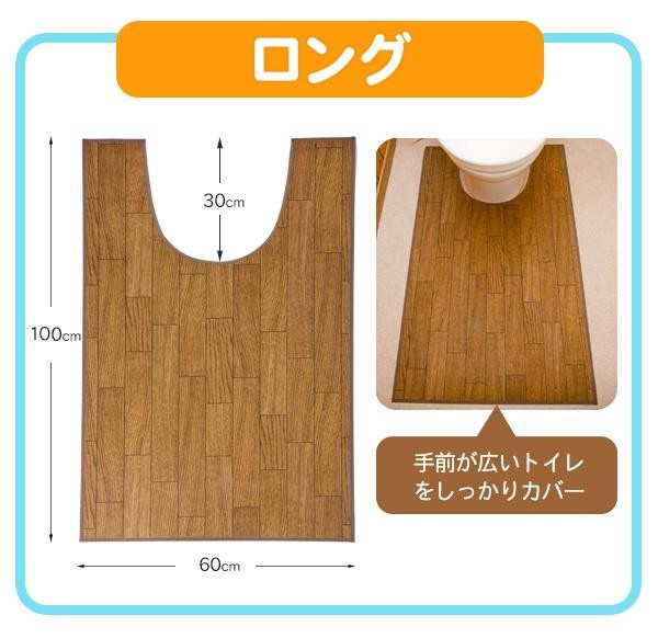 「大きいサイズのトイレマットは洗うのが大変!」という声にお応えして、サッとひと拭きするだけで簡単にお掃除できるトイレマットが誕生しました。使わない時はくるくる巻いてコンパクトに収納できます。手前が広いトイレをしっかりカバーするロングサイズ!優しい風合いの木目柄です。 |
