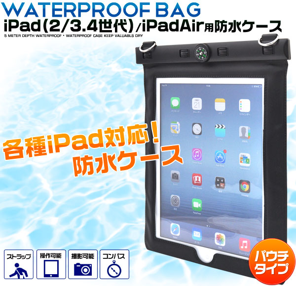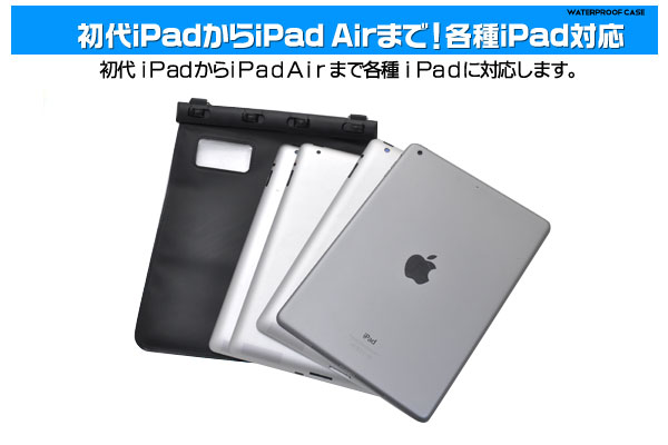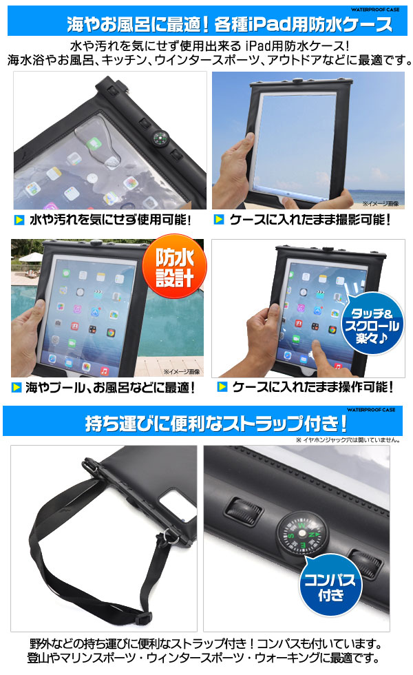 | ■防水加工の各種iPad用ケース! 海水浴やお風呂に便利な、各種iPad用防水ケース! ■すべてのiPadに使用可能! 初代iPadからiPad2、新しいiPad、iPad Retina、iPadAirまで、すべてのiPadで使用できます。 ■静止画・動画の撮影可能! 裏面に透明のカメラ窓がついているので、雨や水・砂の浸入を恐れず、海やプールで静止画・動画を撮影可能! ■ケースにいれたまま操作可能! ケースに収納したまま、タッチ・ホイール操作がスムーズに行なえます。 ■野外の持ち運びに便利なストラップ付き! 野外の持ち運びに便利なストラップ付き! 登山やマリンスポーツ・ウィンタースポーツ・ウォーキングに最適です。コンパスも搭載しています。 ※イヤホンジャック穴は開いていません。 | ![]() |