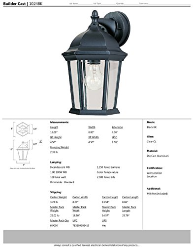 Maxim 1024BK Builder Cast 1-Light Outdoor Wall Lantern, Black Finish, Clear Glass, MB Incandescent Incandescent Bulb , 100W Max., Dry Safety Rating, 2700K Color Temp, Standard Dimmable, Glass Shade Material, 5750 Rated Lumens
