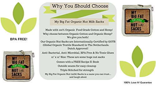 -. Title : My Big Fat Organic Nut (milk) Sacks. Set of 2 Bags (12"x12") Commercial Quality Organic Cotton & h.e.m.p Reusable Almond Milk Bag Strainers. Juicing Sprouting Jelly Cheesecloth Coffee Press Tea Sieve