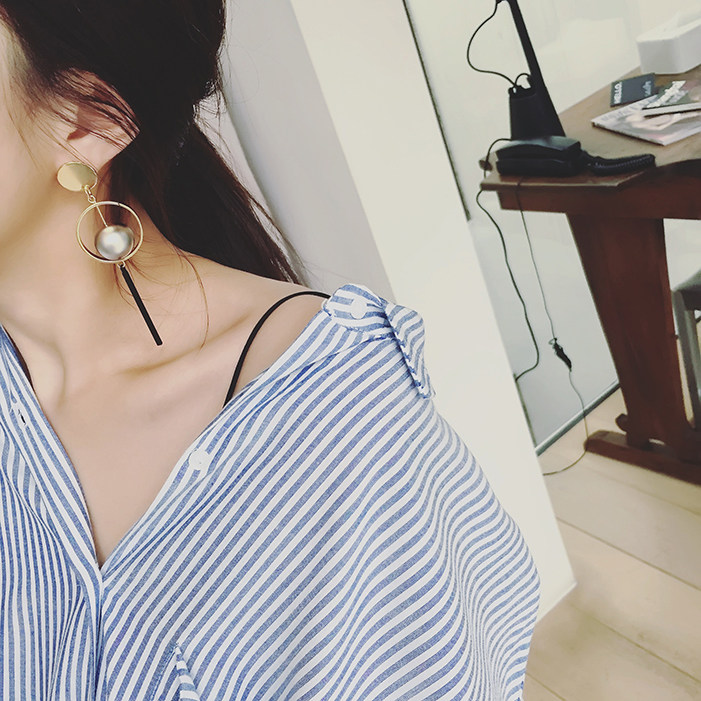 日韩长款镂空耳坠金属质感珍珠几何现代感圆形环珍珠耳钉耳环女