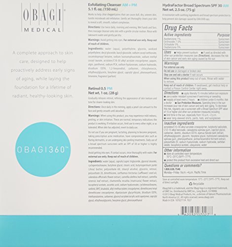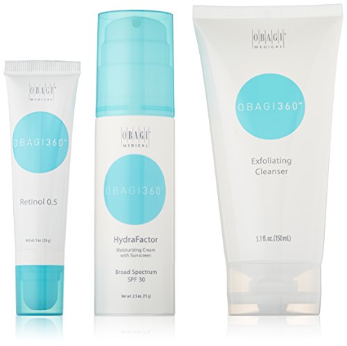 Lay the foundation for a lifetime of radiant, youthful-looking skin with a proactive skin care system that helps protect against future damage and improves dull, uneven skin texture and tone. The obagi360 system is a complete approach to help protect and preserve youthful-looking skin. This unique, all-encompassing skin care system is designed to help proactively protect and improve the look of skin texture and tone, while laying the foundation for a lifetime of radiant, healthy-looking skin. The obagi360 system is ideal for younger patients. A unique combination of effective ingredients provides early intervention. Contains exfoliating cleanser 5.1 fluid ounce, retinol 0.5 1.0 fluid ounce, hydra factor spf 30 2.5 fluid ounce.Feature