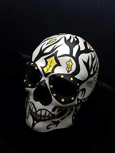 -. Feature : Day of the Dead Masquerade Mask - Foot P.R.Int Themed Dia De Los Muertos Halloween Mask / Popular Choice for costume events, Mardi Gras, mask parties, etc. / This mask has been Voted Most Popular for its attention to half face mask. / The Venetian Mask is secured with two black silk ribbon ties for easy adjustment. / Materials: It's made of Resin with Venetian paint design.