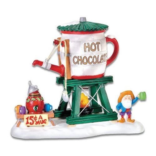 This elf has found an interesting job. He is selling hot cocoa from his "Hot Chocolate Tower". This large scale accessory is made of porcelain and has a hand-painted finish. Brightly colored mugs await the customers and the sign advertises the price to be 15 cents per mug. The North Pole Series is designed and manufactured exclusively by Department 56.Feature