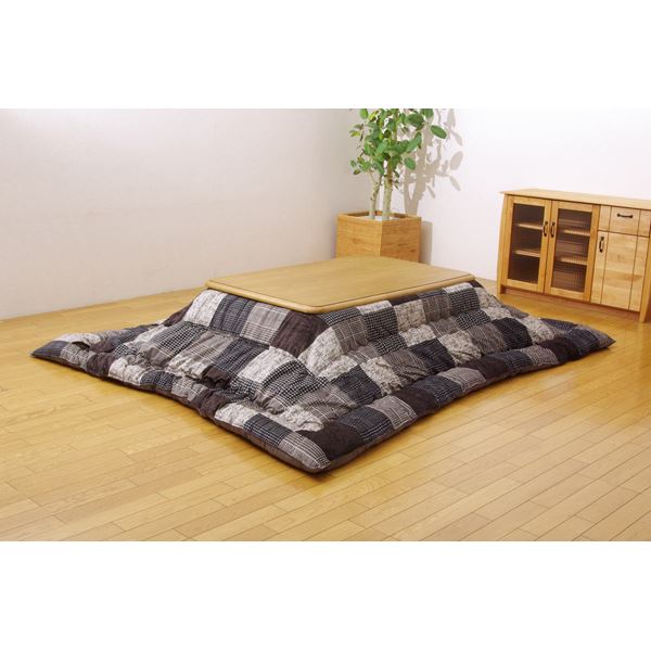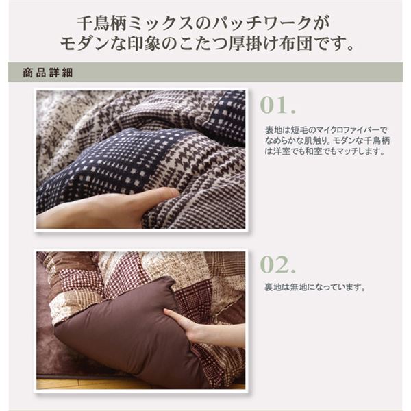 千鳥柄ミックスのモダンなパッチワーク風こたつ布団です。繊細な柄をプリントすることで、まるで本物のパッチワーク生地のような仕上がりとなっております。カラーはモノトーンの深みのあるシックなカラーでまとめ、モード感のある大人の雰囲気仕上げております。表地には柔らかな肌触りの短毛のマイクロファイバー生地を使用しています。部分暖房のこたつは電気代もお得です。