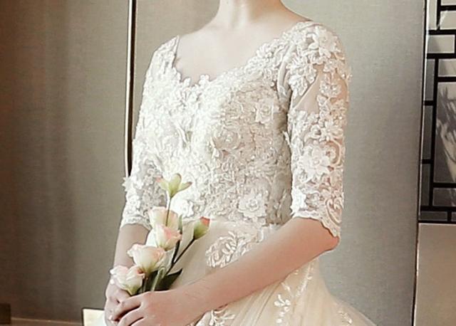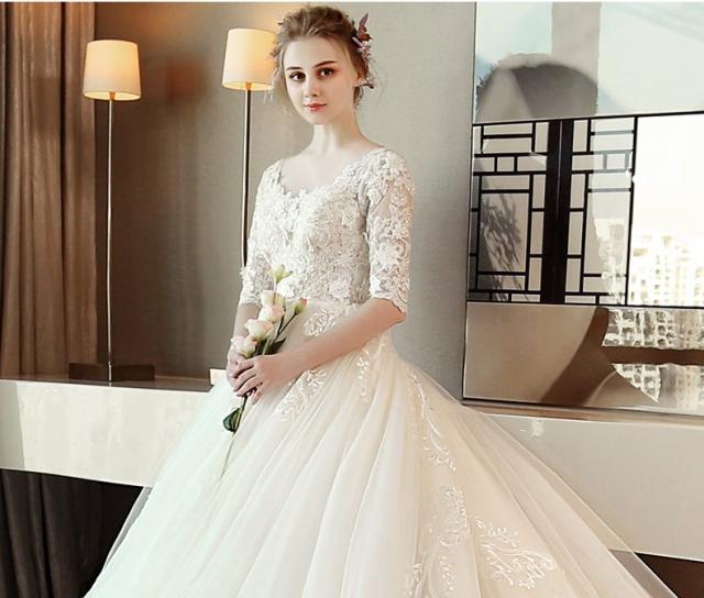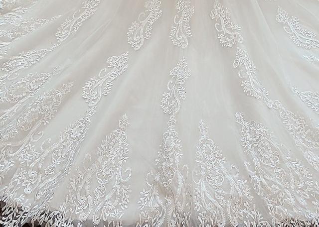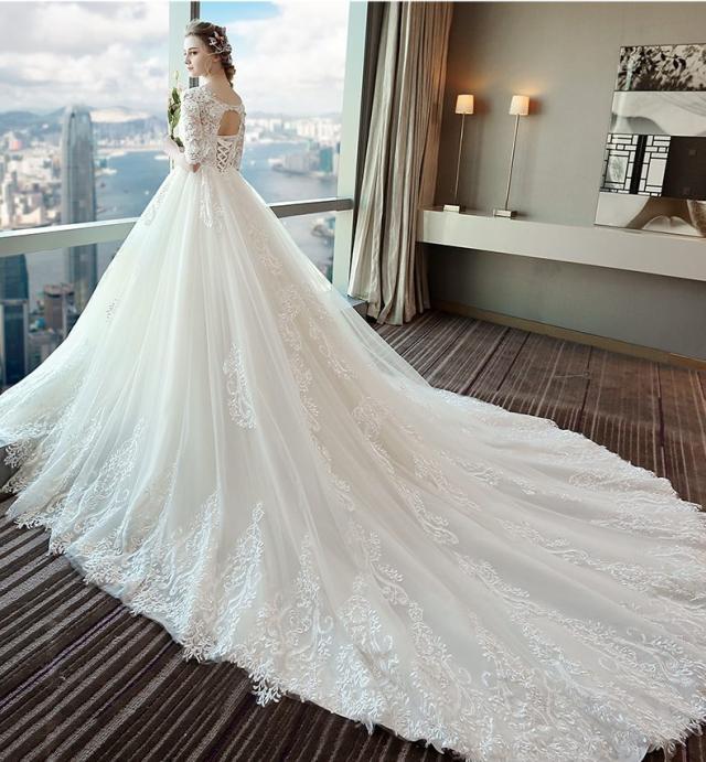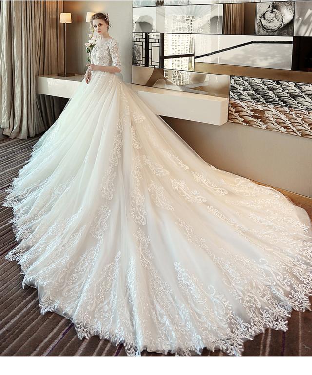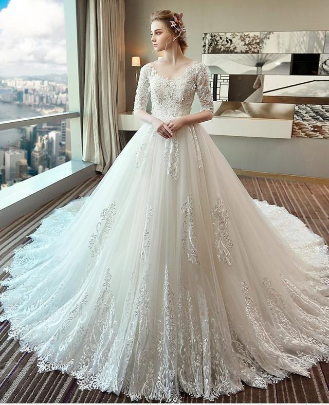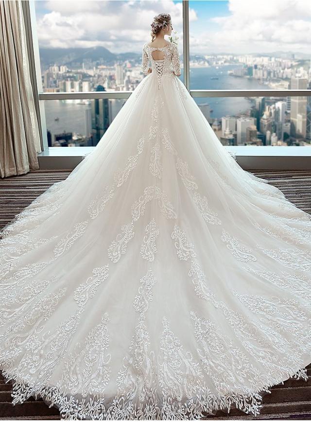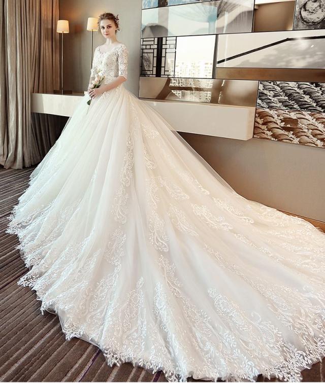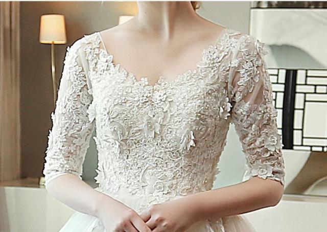 Vネック 袖あり 五分丈 刺繍 レース チュール 花 ロングドレス ウェディングドレス 花嫁ドレス 結婚式 二次会 披露宴 前撮り フォトウェディング スピンドル レースアップ 調節可能 ホワイト系 シンプル 大きいサイズ マタニティ L 2L 3L 4L 5L プリンセス 真珠