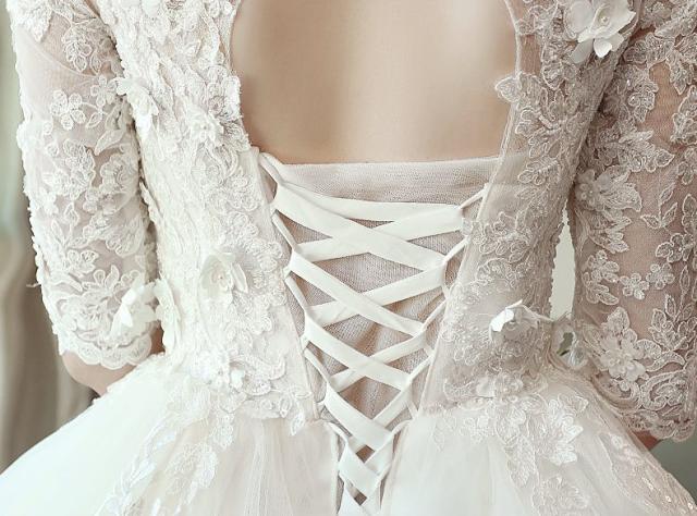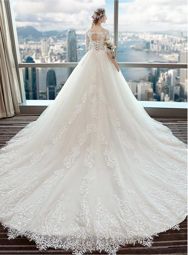 クラシカルな美しいレースがバックスタイルまでデザインされたウェディングドレスで、ワンランク上のヒロインに。