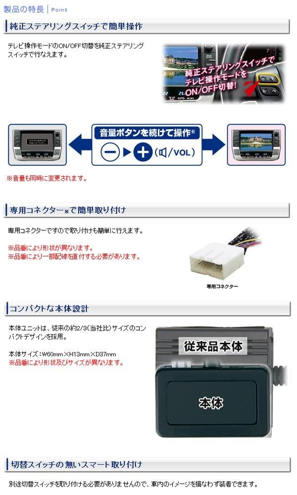 テレビをより楽しく快適に♪テレビ操作モードのON/OFF切替を純正ステアリングスイッチで行なうことができ、本体ユニットは、従来の2/3(メーカー比)サイズのコンパクトデザインを採用。また、専用コネクターで取り付けも簡単です。 |
