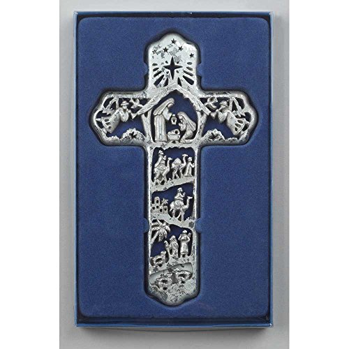 Nativity Scene Cross Brushed Silver Tone 7 x 12 Resin Stone Christmas Wall Sign Plaque
