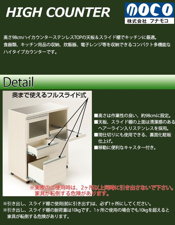 | 食器類、キッチン用品の収納、炊飯器、電子レンジ等を収納できるコンパクト多機能なハイタイプキッチンカウンターです。作業性の良い高さ約98cm、TOPの天板とスライド棚上面はステンレス製で移動に便利なキャスター付きです。裏面化粧板仕上げなので、間仕切りにも使用可能です。 |
