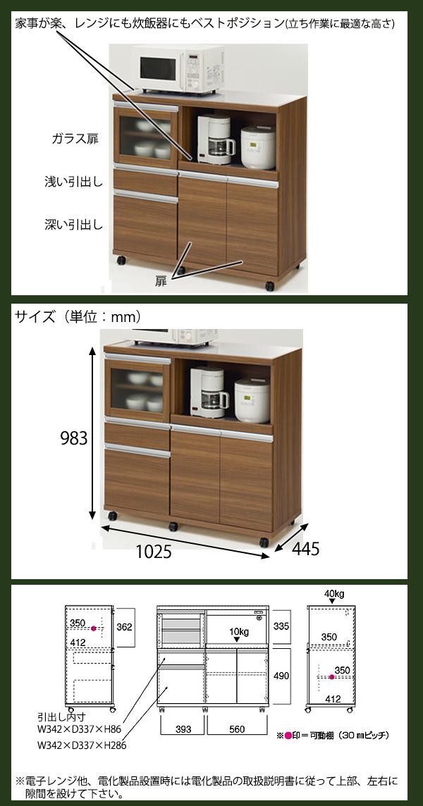 | 仕様 | 完成品(キャスターのみお客様取付け) 天板耐荷重:40kg スライド棚・可動棚耐荷重:10kg 可動棚:大1枚、小1枚 裏面化粧板仕上げ コンセント:1500W(2ヶ口) コード長:150cm 説明書付き キャスターストッパー付 |