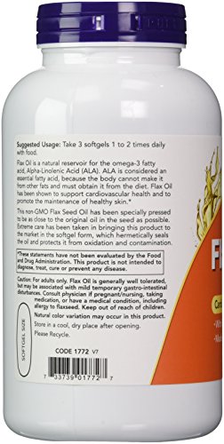 Flax Oil is a natural reservoir for the omega-3 fatty acid, Alpha-Linolenic Acid (ALA). ALA is considered an essential fatty acid, because the body cannot make it from other fats and must obtain it from the diet. Flax Oil has been shown to support cardiovascular health and to promote the maintenance of healthy skin.* This non-GMO Flax Seed Oil has been specially pressed to be as close to the original oil in the seed as possible. Extreme care has been taken in bringing this product to the market in the softgel form, which hermetically seals the oil and protects it from oxidation and contamination. Each serving may also have the following naturally occurring amounts of polyunsaturated fats and monounsaturated fats: Linolenic Acid (Omega-3) 55%; Linoleic Acid (Omega-6) 14%; Oleic Acid (Omega-9) 19%; Other (Saturated) 12%.Feature