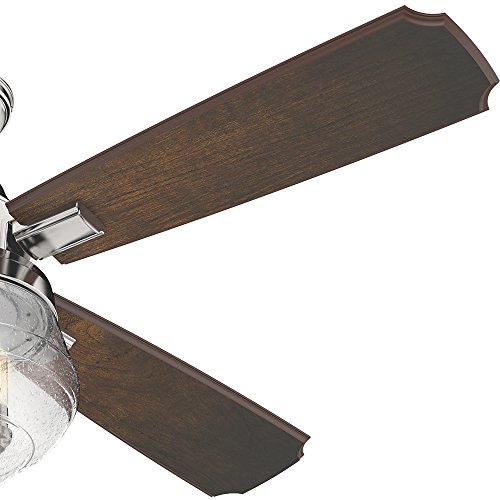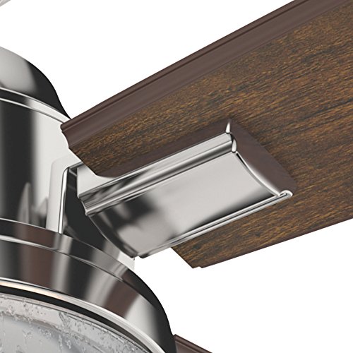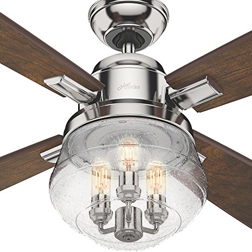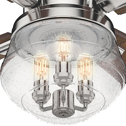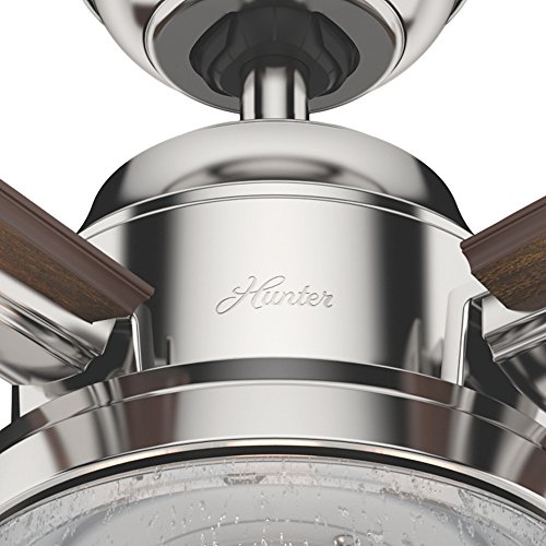 The glamorous Sophia is a unique artistic statement like no other ceiling fan. The Polished Nickel and premium carved-wood blades highlight the centerpiece of the design: a beautiful globe of seeded glass surrounding a chandelier-style light fixture with exposed LED bulbs. This trendy fan is part of hunter’s masterpiece collection, which means state-of-the-art design and top-of-the-line features like dimmable bulbs and a fully functional handheld remote.