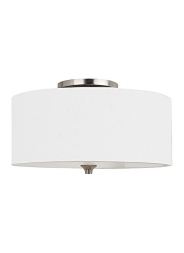 The Sea Gull Lighting Stirling two light flush mount fixture in brushed nickel provides abundant light to your home, while adding style and interest. The Stirling lighting collection by Sea Gull Lighting, with its chic style and eclectic twist brings clean, modern lines to a traditional soul. The Beige Linen drum shades combined with a Burnt Sienna finish or White Linen drum shades combined with a Brushed Nickel finish are both eye-catching and inviting. For the wall/bath fixtures only, a Chrome finish coupled with Opal Etched glass shades is also available. The assortment includes nine-light, five-light and three-light chandeliers, pendants in six sizes, both flush and semi-flush ceiling fixtures, a one-light wall sconce, as well as one-light, two-light, three-light and four-light wall/bath fixtures. Most of these fixtures easily convert to LED by purchasing LED replacement lamps sold separately.Feature