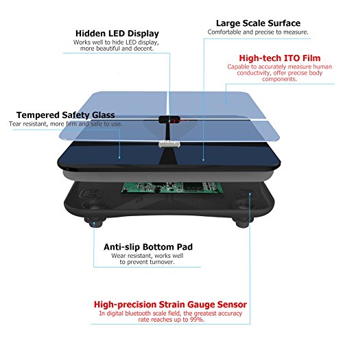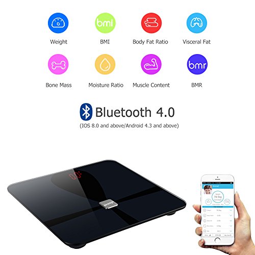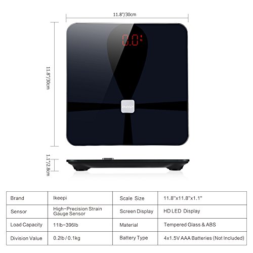 Studio : Ikeepi Publisher : Ikeepi Binding : Health and Beauty Product Description Ikeepi Body Fat Scale Features: -To measure Body Fat, Bone Mass, BMI, BMR, Visceral Fat, Water and Muscle Content pls downlod App - APP: download "New iwellness" app in APP Store or Google Play - Compatible systems: Android 4.3 / IOS 8.0 and above - Bluetooth 4.0 - Share feature: Click into history and you can share the date via Twitter / Email / SMS / Facebook - Super Easy Setup App allows Up to 10 member accounts - Additional features: baby mode - Overload indicator - Step-on technology - Sleek and Modern Design - Anti-slip rubberized cradle - HD LED digital display - Auto-Off if no operations in 10s Specification Material: ABS tempered glass Dimensions: 11.8'x 11.8' x1.1' (L* W * H) Measurement units: lb / kg Division value: 0.2lb / 0.1kg Precision: 0.1kg (musclebone), 0.1% (fat water) Overload indication: "ERR" Load capacity: 11-396lb Low battery indication: "LO" Package list: 1* weight scale; 1* user manual Note: 1.This scale is designed for use on flat, hard surfaces. Measurements will be compromised on non-ideal surfaces. Avoid carpet or soft surface. 2.After changing batteries or moving the scale, take a moment to let it calibrate itself before measuring. 3.Measuring weights must be at least 11 lb Warranty Customer Service Any item sold by Ikeepi can enjoy free replacement or refund in grand total within 12 months