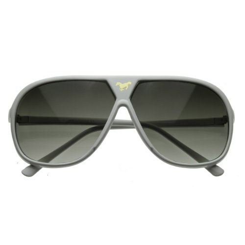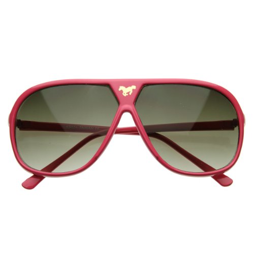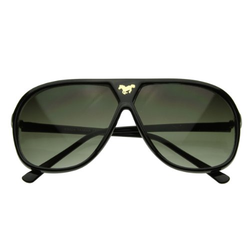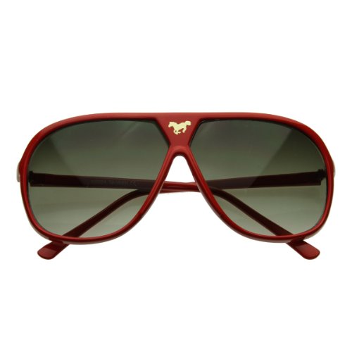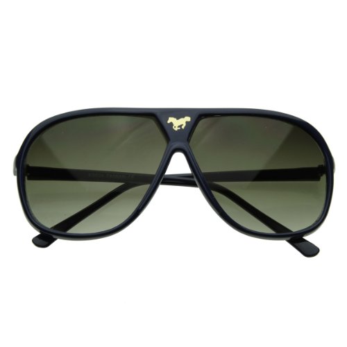 Retro styled aviator sunglasses that feature a golden horse in the center of the bridge. Very cool remake of an original icon that has been a hit for decades. Made with an acetate based frame, metal hinges, and gradient polycarbonate UV protected lenses. Lens Height:50mm Lens Width:62mm Bridge:14mm Frame Total:141mm
