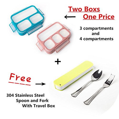 Leakproof Bento Lunch Box Container For Kids and Adult –2 Leakproof Containers with 3 and 4 Compartments–1 Tableware Set(Stainless Steel spoon and fork)–BPA Free Microwave and Dishwasher Safe