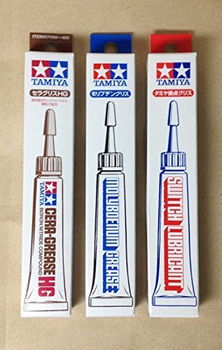Studio : TAMIYA Publisher : TAMIYA Binding : Toy Product Description This is a set of 3-type Grease from Tamiya. YOU WILL RECEIVE:3 Tubes of Grease. Cera-grease HG [87099] : High-performance grease consists of extremely fine boron nitride particles which can reduce friction loss by 50%. Apply to both plastic and metal parts such as gears, axles, and joints to increase efficiency. (Do not apply to switches.) Molybdenum grease [87022] : Suitable for gears and moving parts in mechanical operations. It maintains its viscosity in a wide temperature range, reduces friction, and the molybdenum properties cover the entire surface well.(Grease may be harmful it ingested. Keep off of clothing and do not use on electrical switches or contacts.) Switch lubricant [87023] : Designed for use on R/C speed controllers to prevent arcing, increase current flow and lengthen controller life. If speed controller becomes dirty with sand or dust, wipe clean and re-apply the lubricant. Net: 10-gram / Made in Japan. 0