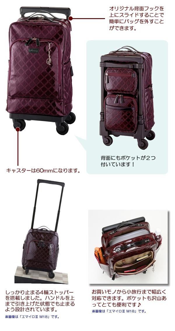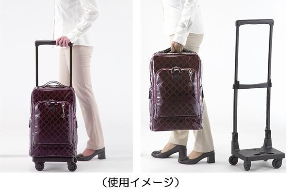 国内線機内持ち込み可能サイズ。華やかでエレガントな雰囲気がおしゃれです♪4つの車輪の向きを変えて固定する4輪ストッパーによりしっかりと止まります。フレームを外して、バッグ単体でもご使用いただけます。 |
