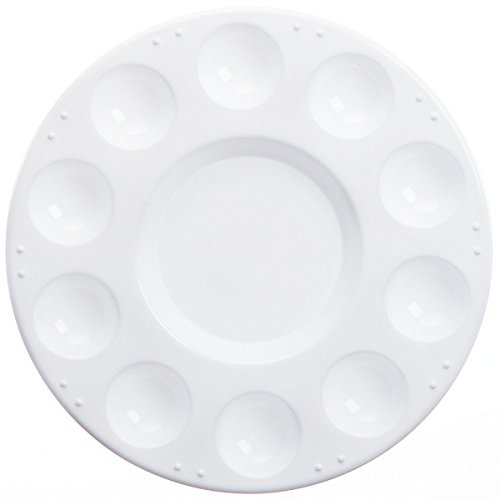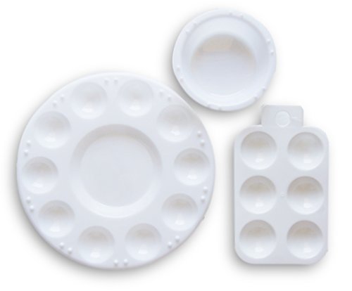 -. Feature : Variety painting palette and bowl set / 3 pieces / Largest palette is 7'' round, with 10 wells and dip in center for mixing / Rectangular palette measures 5'' x 3.5'' and includes 6 wells / Painting bowl is 3.5'' across and 1'' deep, perfect for mixing paints or holding paint