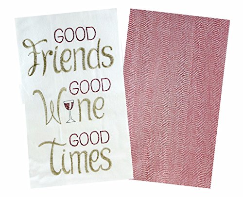 - One Towel features The Phase "Good Friends Good Wine Good Times" and the other is red chervon pattern.