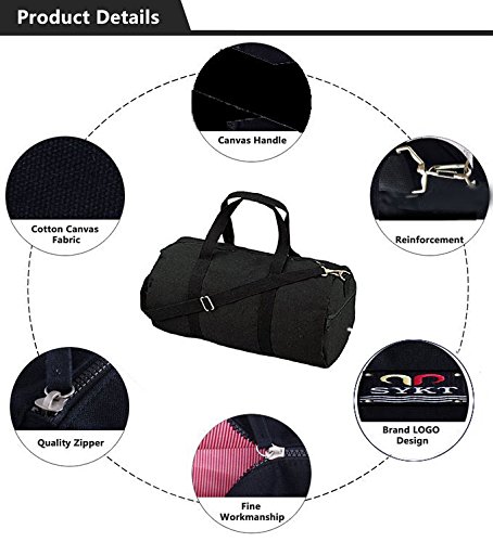 -. Brand : SYKT -. Department : unisex-adult -. Feature : Made with Durable Heavyweight Cotton Canvas Material / Includes a Detachable and Adjustable Shoulder Strap / Twin Web Carry-On Handles for Easy Lifting / Zipper End Pocket Allows for Easy Packing / Large Zipper Compartment Perfect for Sports Gear and Duty Equipment -. Model : CANVASBAGS-1 -. ProductGroup : Apparel -. ProductTypeName : LAGE -. Title : SYKT Canvas Duffle Bag Travel Totes Handbag Weekender Bag