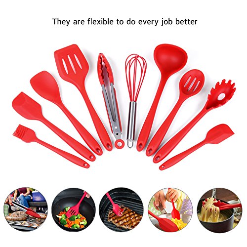 - We specialize in the manufacture and sale of high quality items Best for your choice. Specifications: Color: Red Material: Silicone Package Weight: 831g Features: This spatula set is especially designed out of only one piece silicone , so you're guaranteed that no nasty dirt would come inside the cracks. Also, unlike their old-school counterparts, these spatulas won't fall off after just a few uses. They come in non-sticky design and have maximum endurance to high heat. A good kitchen investment indeed! So what are you waiting for? Get this set today and make your cooking a lot more enjoyable! SPECIAL DESIGN: *Hygienic: Solid silicone surface on these kitchen utensils means no crevices for bacteria to grow *100% FDA Grade, BPA Free Silicone coated cooking utensil set *Perfectly shaped heads: perfect for all those hard to reach places *Ergonomically designed silicone coat *Non-stick cooking utensils: Won't scratch pots and pans *Dishwasher safe kitchen tools *HEAT RESISTANT (UP TO 550°F ) Package Included: *1x pointed spatula --28cm *1x basting brush--21cm *1x pointed spatula--21cm *1x round-edge turner--27cm *1x ladle --29cm *1x straight-edge turner--30.5cm *1x Spoon--27.5cm *1x tongs --9 inch *1x wisk --10 inch *1x pasta fork--28cm 0
