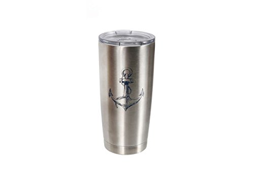 This 20 Oz. nautical themed stainless steel insulated large travel mug is perfect for use on land or at sea! Made with 18/8 kitchen grade stainless steel, mug features copper lined double wall vacuum insulation designed to keep your hot drinks warm for up to 12 hours and your cold drinks cool for up to 24 hours. Comfortable, sleek shape bears a navy blue anchor design and its large base adds stability. Functional wide mouth opening has a clear, sliding lid for sipping and rubber gasket to prevent leaks and spillage. This stylish thermos is a safe, healthy alternative to plastic bottles and cups. Hand wash recommended. Measures approx. 7.25" tall by 3.5" diameter.Feature