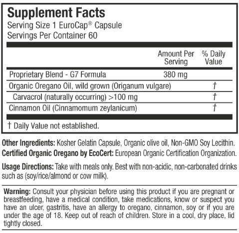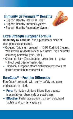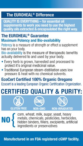 - Feature : EXTRA STRENGTH EUROPEAN FORMULA: 100% ORGANIC Wild Oregano oil (Origanum Vulgare -- Mediterranean Mountain Grown) Synergistically Blended with a Scientific Dose of Pure Therapeutic Grade Cinnamon Oil (cinnamomum zeylanicum) // Supported by Independent Scientific Research from: Georgetown University Medical Center & Cornell University / FEEL THE DIFFERENCE: Boost Immune Response & Recovery* // Best Candida Cleanse // Advanced Remedy for Yeast Infection // Eliminate Thrush // Natural Fungal Cleanse // Eliminate Harmful Bacteria & Parasites* // Natural Digestive Support* // Natural Respiratory Support* // Organic Immune Support // Improve Resilience against Cold, Flu & Infection // A "Must have" for professionals, parents, students, athletes and travelers / EUROHEAL® MANUFACTURING TECHNOLOGY Guarantees UNMATCHED Potency & Bio-availability // 400% MORE Carvacrol PER CAPSULE than leading Oregano brand (Guaranteed 100mg of Carvacrol per EuroCap® liquid capsule) // The World's Highest NATURALLY Occurring Carvacrol content (80%+) // Safe & Balanced Thymol ratio (under 3%) // Whole Herb is Gently Steam Distilled to yield a Holistic Full Spectrum Oil (over 70 synergistic nutrients) // / GUARANTEED SAFE, PURE & EFFECTIVE: Certified Organic in Europe by EcoCert® // NON-GMO // Free of Heavy Metals // NO Excipients (no binders, fillers, flow agents, chemicals, plasticizers, preservatives, enteric coating, or artifical ingredients) // Manufactured in a state of the art FDA registered cGMP facility // / 60 LIQUID EUROCAP® Capsules // More Potent, Fresh & Effective than softgels // Unique nitrogen "Freshness bubble" Protects against Oxidation // Easy to Swallow // Easy to Digest // Cutting Edge European Encapsulation Technology Guarantees Potency & Purity // Sealed without heat, oxygen or chemicals // Active Ingredients inside EuroCaps® are Delivered & Absorbed by your body much better than soft-gels, tablets or powder fill capsules