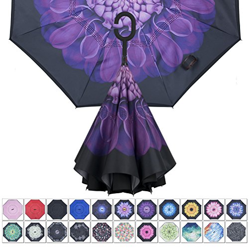 -. Feature : INNOVATING REVERSE FOLDING DESIGN: It is easy to open the umbrella by pressing the red button and then push it upward to the top. And it would be collapsed upwards instead of the past ways when pulling it back, that's will keep you from getting wet when you're getting in and out of the car on rainy days. Also, the carrying bag case is included for your convenient storage. / KEEP YOUR CAR DRY: Compared with the ordinary umbrellas, this inverted umbrella would keep your car dry when in the rainy. It will trap the water inside to prevent water dripping around when the umbrella folded up, so that your car won't be splashed with water. In addition, this inverted umbrella can stand up on it's own to dry when closed, free you the hassle of unfolding it even when not in use to avoid rusting and mildew without drying. / WATERPROOF & WINDPROOF: Constructed with 8 carbon fiber stick which are extremely firm and sturdy, enable it still work well even in the roughest stormy weather. And the double layer water resistant fabric covered design make it durable enough to resist leakage, and prevent your hands from accidental pinching by the frames. / C-SHAPE HANDLE RELEASE YOUR HAND: With portability in mind, this inverted umbrella has been specially designed with a C-shape handle to allow easy-to-carry. At the same time, it'll leave your hands free for using a mobile phone or carrying something when using the umbrella. / FASHION & VARIETY OF FLORAL AVAILABLE: Manufactured with a P.R.Inted fabric at the bottom which provide a stylish looking, and so many different pattern available for your choose to avoid embarrassment of wrongly taking others' umbrella or taken by others.