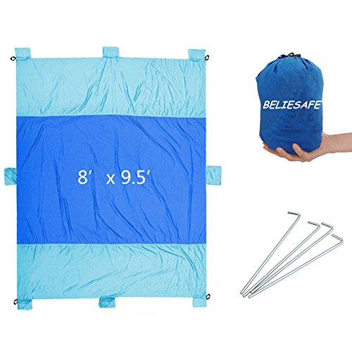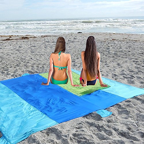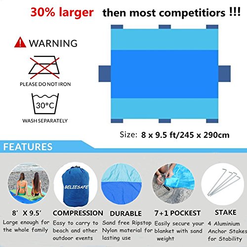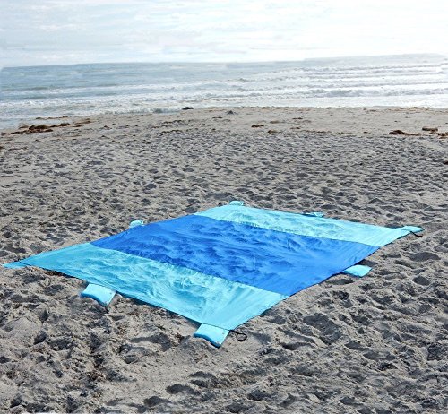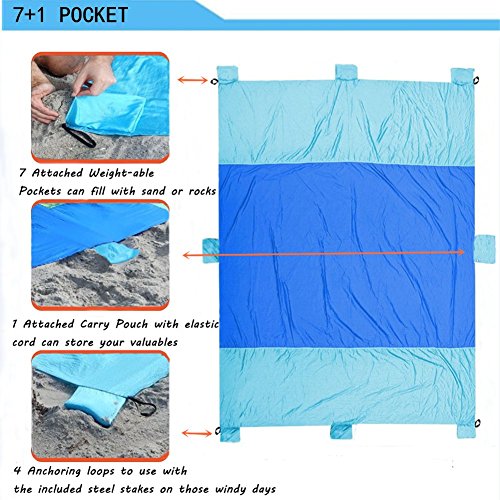 7+1 ANCHOR POCKETS MAXIMIZE YOUR BLANKET SECURITY AND STABILITY - Never worry about the wind taking away your blanket!6 Sand Pockets. 1 additional sand pockets and 1 carry pouch on the long side of the blanket have been added to keep you anchored in the wind. Stake loops on the 4 corner pockets for anchoring in the grass or dirt or for tying over head for shade or tent cover.FREE BONUS 4 premium quality Aluminium anchor stakes include