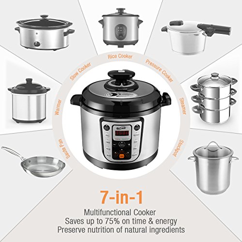 Combines 7 kitchen appliances in 1, Pressure Cooker, Slow Cooker, Rice Cooker, Steamer, Sauté, Warmer, prepares dishes up to 70% faster to support your busy lifestyle