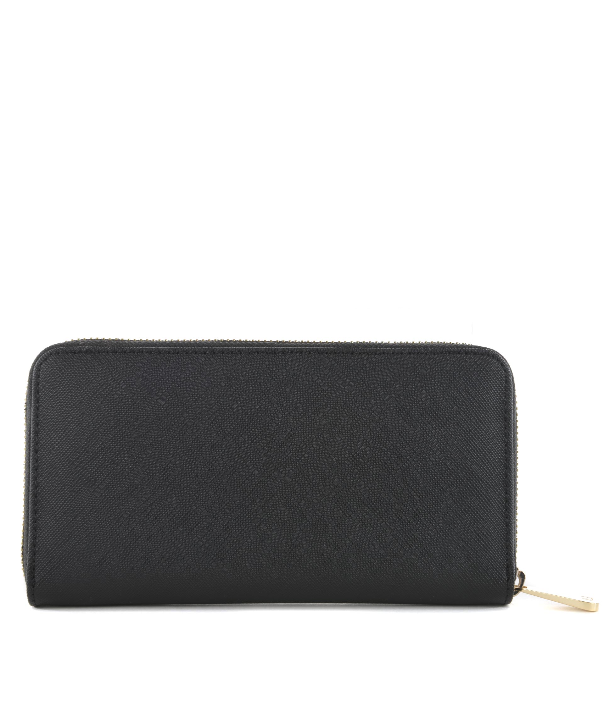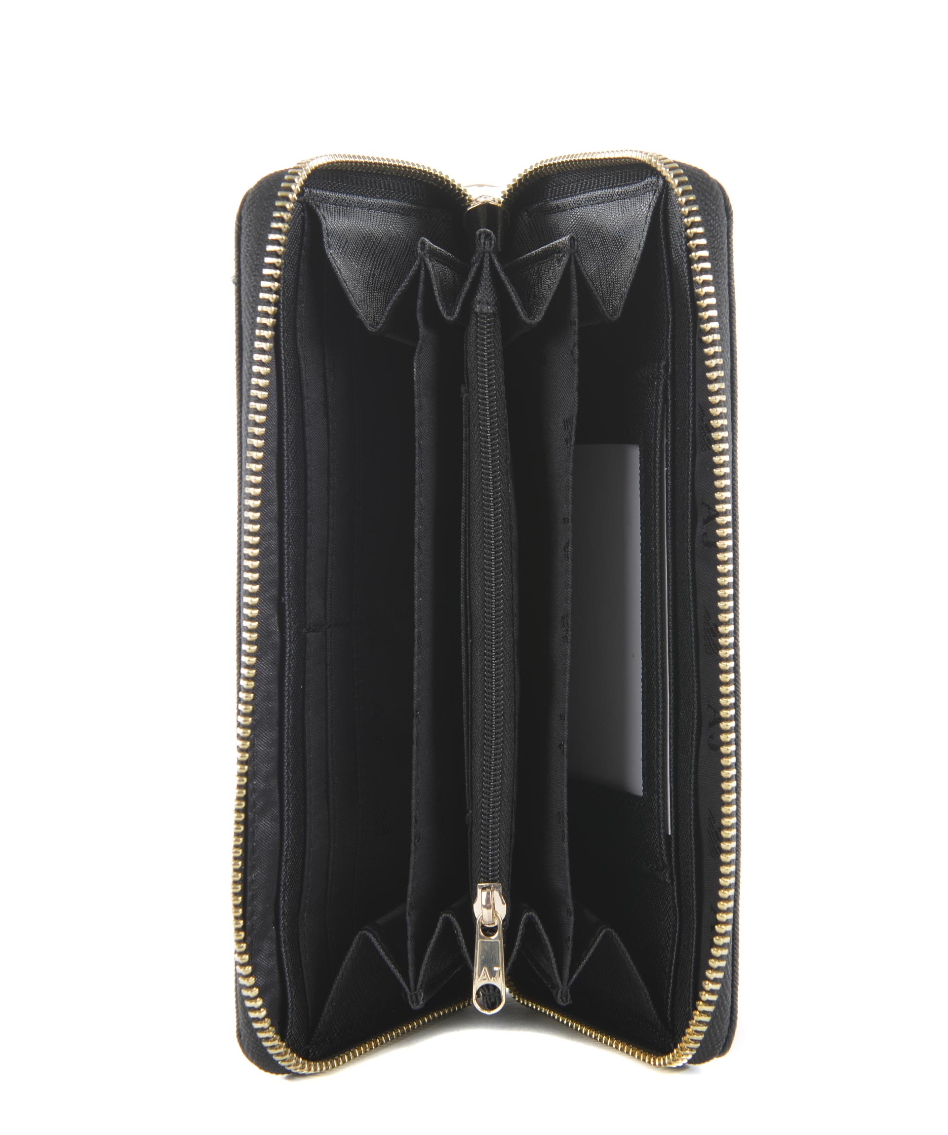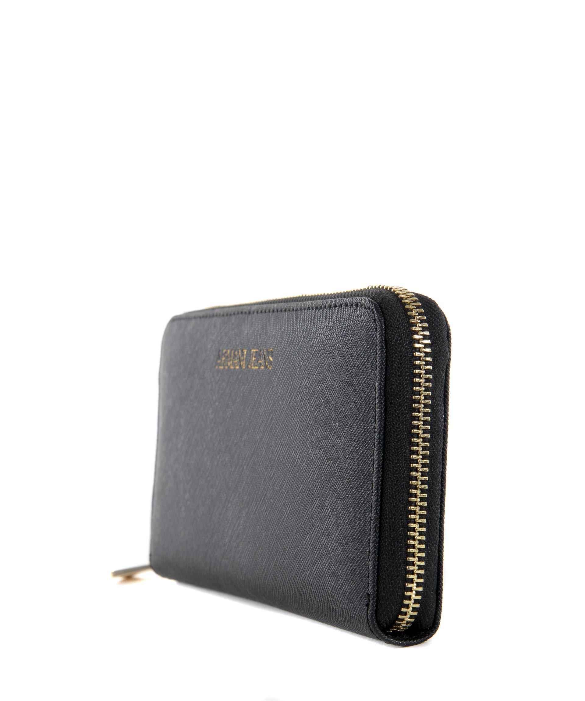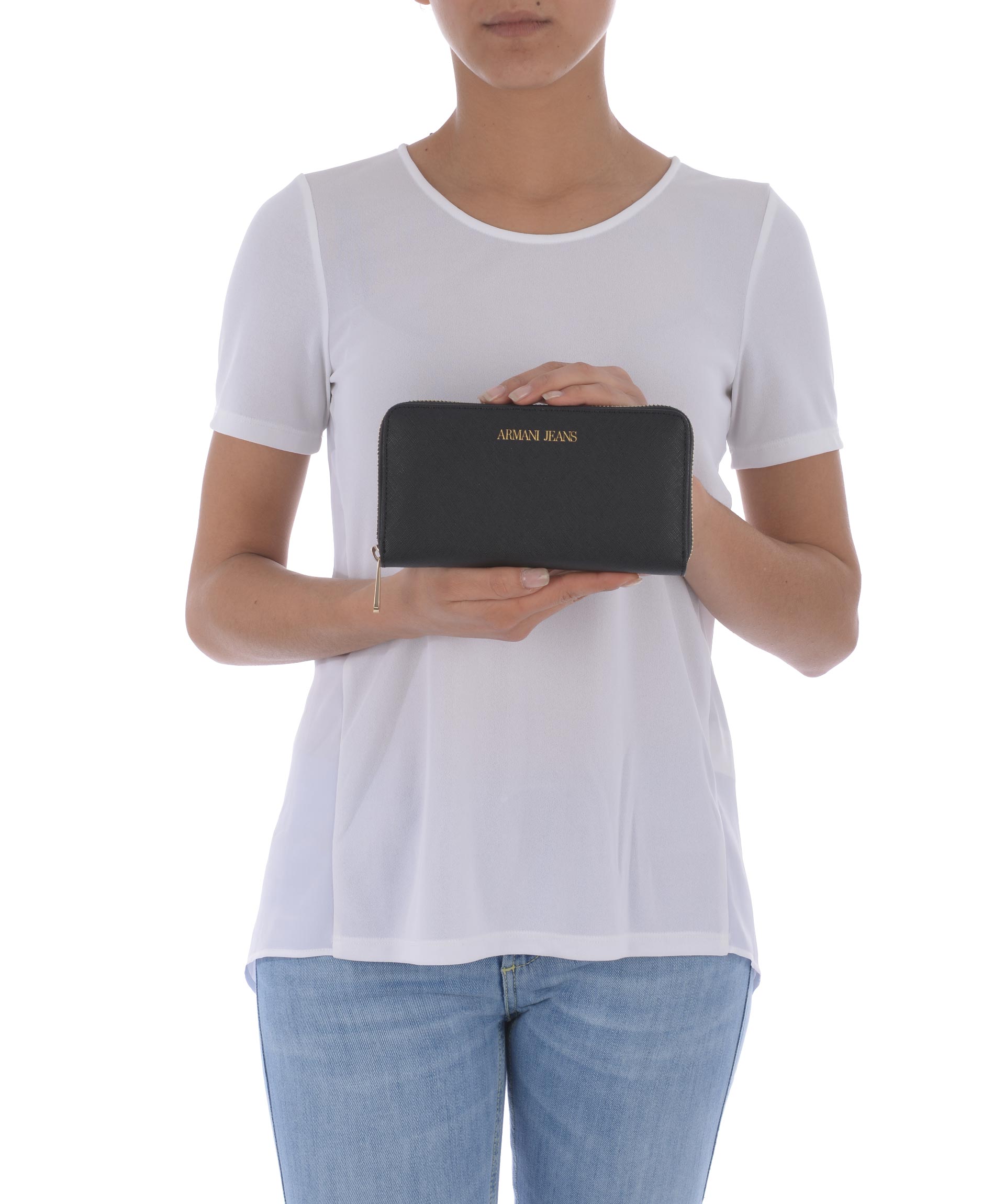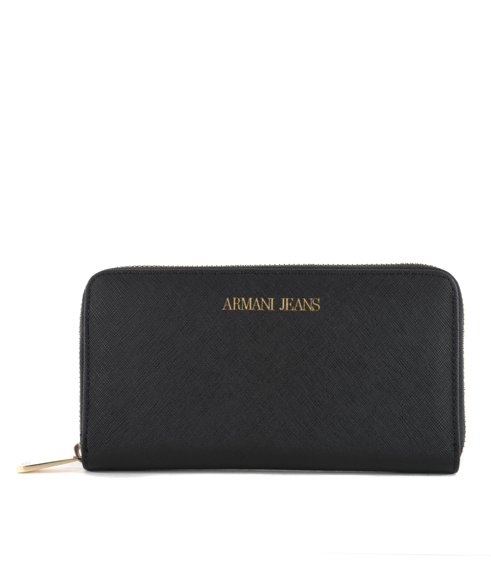 Portafogli Armani Jeans in ecopelle stampa saffiano Nero. Apertura con zip. All'interno tasca con zip, scomparti per banconote, tasche per carte di credito. Logo frontale stampato. Fodera logata.
