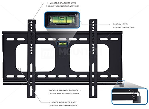 -. Feature : Functional. MI-305S is a fixed wall mount with a security locking bar for padlocks, three adjustable height settings, and a low profile extension. The height of your flat screen monitor can be adjusted after mounting your device. It is also VESA compatible with 100x100 200x100 200x200 300x100 300x200 300x300 400x100 400x200 and 400x300 / Compatibility and Range of Motion. The stand wall mounting plate is built for 23 to 37 inch monitors and it has a load capacity of 100lbs. The VESA compatibility and high load capacity makes this a good option for versatile and varying displays. This mount only extends 1 inch from the wall which keeps your space slim and modern. It wonderfully accentuates your slim LCD, or monitor flat screen / Locking. The secure locking padlock bar is ideal for schools, offices, businesses, and public areas. The anti-theft lock bar is easy to use and protects your device from theft, tampering, or misaligning. This mount also comes with a built in bubble level to make assembly, mounting, and aligning much easier / Dimensions. The total dimensions of the hardware of this fixed stand is 22x13.75 inches. Even behind the slimmest and smallest display, your hardware will not be visible. It is also equipped with many easy access cable management holes in the plate to keep your cables organized and clean. Mounting your display or monitor will not only organize your cables, but it will organize your space / Sturdy and Elegant Design. Get rid of your bulky television stands taking up desk, counter, or office space and replace them with the MI-305S. Its aluminum alloy metal is durable and enduring. The mount comes with easy to follow instructions and all necessary hardware included