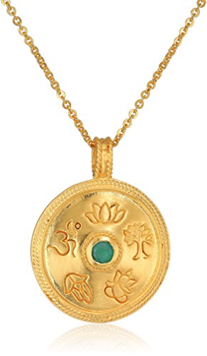 Find your center with the Satya Jewelry Mandala Pendant Necklace. Unite many paths into one with this circular gold and emerald mandala pendant with chain. Designed for a woman's life journey, this handcrafted piece provides an inspiring, empowering symbol in 18-karat gold plate over brass. Surrounding a single emerald, the symbols of Ganesha, the Om, Hamsa, Lotus, and Tree of Life balance the golden circle. Secure the 30-inch necklace around your neck with the spring-ring clasp. This necklace makes a great accessory for yourself, family, or friends with the included Satya Jewelry gift pouch.Feature