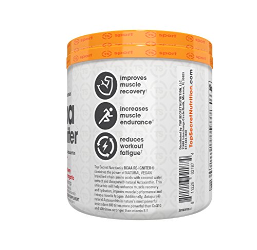 -. Binding : Health and Beauty -. Brand : Top Secret Nutrition -. IsAdultProduct : 0 -. Label : Top Secret Nutrition -. Manufacturer : Top Secret Nutrition -. ProductGroup : Health and Beauty -. ProductTypeName : HEALTH_PERSONAL_CARE -. Publisher : Top Secret Nutrition -. Studio : Top Secret Nutrition -. Title : Top Secret Nutrition BCAA Re-Igniter Vegan Amino Acid Supplement with Astaxanthin and Electrolyte, Hydration Blend with Coconut water, 9.84 oz (30 servings), Pineapple Mango
