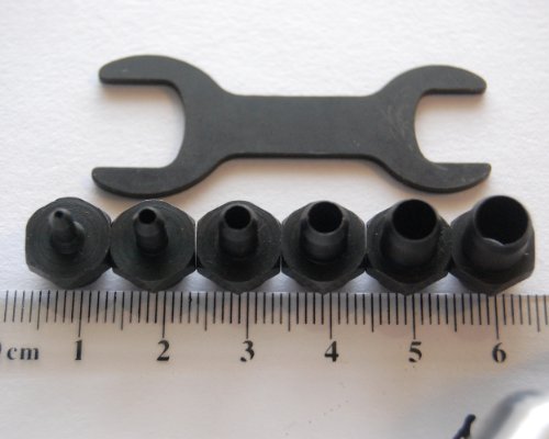 Main 3-in-1 aluminium tool, with 6 die heads to create round holes 1 mm, 2 mm, 3 mm, 4 mm, 5 mm, 6 mm, set of eyelets insertion heads, set of snap button setting heads, plastic screw top cylinder to place setting spanner and spare heads and die cutters, 100 free eyelets across 4 colors: copper, black, silver, gold AND 25 snap button sets (composes of 4 bits that create the snap button).