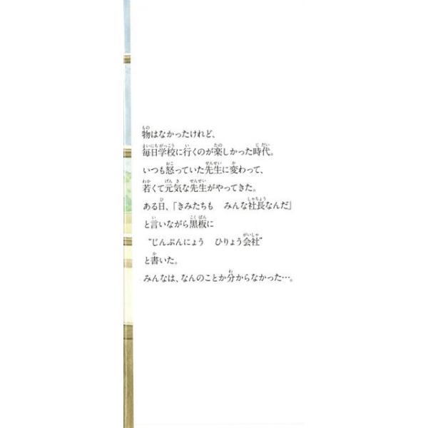 【商品説明】 定価(税込み):1,404円 値引き:10% OFF 物はなかったけれど、毎日学校に行くのが楽しかった時代。いつも怒っていた先生に変わって、若くて元気な先生がやってきた。ある日、「きみたちも みんな社長なんだ」と言いながら黒板に“じんぷんにょう ひりょう会社”と書いた。みんなは、なんのことか分からなかった…。 バーゲンブック 新品 特価 格安 子ども ドリル 低学年向読み物 絵本 えほん 低学年 読み物 会社 時代 | |