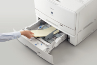 ペーパーフィーダーオプションの500枚ペーパーフィーダーは100mm~297mmまでの用紙幅に対応。振込用紙などの帳票もペーパーフィーダーから給紙可能です。
